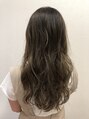 全体にハイライトがたっぷり入ってるスタイルです。ハイライトはベースをどのように作るかによって、スタイルの綺麗さが決まってきます。今回はハイライトをブリーチで入れて、流してから全体にグレーとベージュ系の色を入れてあります