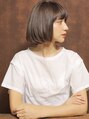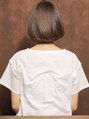 ベースは顎ラインのボブ。内巻きにまとまりやすい様に微妙に前上がりのラインで作り、前髪は目の上でややラインっぽさを残して作っています。カラーはアッシュブラウンで、ストレートスタイルの中にも柔らかさを感じる様にしています。