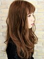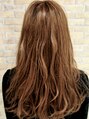 アウトラインをラウンドにカット。トップにレイヤーを入れて質感調整。前髪は眉毛下でカット。カラーはベージュで柔らかさをだして。パーマは20ミリから15ミリで平巻きと逆巻きを交互に二回転半巻いて。前髪も少し強めにかけても可愛い☆