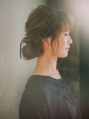 ゆるめにまとめたシニョンが可愛い。下めにまとめることで落ち着きのある大人の女性らしさを演出。首元がすっきりしていてどこかしらセクシーに。崩しを多めにいれてふわふわなアレンジにしてみました。リボンで女の子らしさUP☆