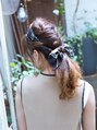 サイドにゆるくツイストでバンダナを編み、センターは編み込みでまとめた、ローポニーアレンジしてです♪決めすぎず、普段のお出かけに大活躍できるスタイルです!!飾りやバレッタをつけるとお呼ばれにもぴったりですね♪