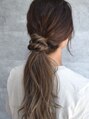 Tシャツにも似合うカジュアルなアレンジスタイル。結び目にネジネジを巻き付ければ、いつもの一つ結びもオシャレな印象に!