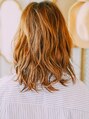 少し目にかかるうざバングが印象的な目元のセミディスタイル。中間から大きめのウェーブが出るようにパーマをかけています。朝のスタイリングも楽に!