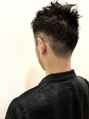3ミリから6ミリでフェードで短くカットしてます。トップは5センチくらいに設定してかきあげ、アップバングどちらも可能です。刈り上げは、バリカンをつかって濃淡をつけるテクニックを使っています。