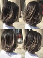 肩上の切りっぱなしボブにハイライトをいれて作る外国人風カラー☆ベースカラーが黒に近いブリーチなしダークグレージュにハイライトをいれました!髪が伸びてもプリンが気にならないバレイヤージュスタイルなのでお手入れも簡単です♪