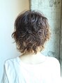 顔まわりを丸くマッシュに切り、えりあしを長めに残したミディアムショートスタイルです。強めにかけたコールドウェーブと長めに残したえりあしがエッジのきいたアクセントをもたらすスタイルです。