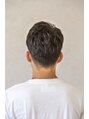横と後ろはスッキリと刈り上げて、上を重めに残したスタイル。軽くクセのある髪なので柔らかい仕上がりになります。