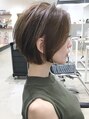 大人女性にオススメのショートです。襟足をタイトにすることで首をスッキリと長く見せることができ、後頭部の丸みとボリュームの位置をコントロールし女性らしい柔らかい雰囲気にしてます。前髪はほお骨下でカットし、毛流れを綺麗に見せてます。グレージュ