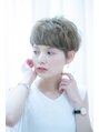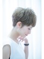カットはベリーショートスタイルに合わせたマッシュで、トップの動きに合わせたもみあげを残すマニッシュ系ジェンダーレスな髪型にしました。耳かけスタイルのような耳は出ているスタイルです。カラーはカーキアッシュで妖艶さと落ち着きを演出しました。