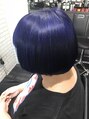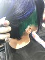 ブリーチした後に、全体を原色カラーのネイビーに、刈り上げ部分を緑に仕上げました。