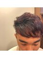 元あるくせ毛を生かしてスタイリングしやすいようにカット。黒髪をベースにレッドバイオレットのハイライトがランダムに入っています。