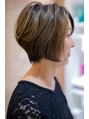 コンパクトなシルエットで手間のかからない前下がり系ショートボブスタイル。ボブ系でも立体感+メリハリを利かせるためにヘアカラーを複色使いでオン。アイロンスタイリングで動きを加えてます。