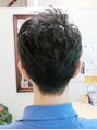 あごのラインの延長線上に、バックのウェイトポイントを設定するのがポイントです。頭の形もカッコ良く見せられます。トップはレイヤーでカットし、丹念にセニングを入れることで、束感と、動きを出しています。