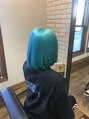 カットは肩上のボブスタイル。カラーはブリーチで16トーンまで上げてから、塩素系カラーのブルーを入れています。中間でトリートメントを入れてケアします。