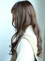 全体的に重くつくったロングのパーマスタイルです。躍動感のある動きをだしています。バックはほぼワンレングスですがトップと顔まわりはレイヤーが入っていますのでカールによるラフな動きが出やすいスタイルです。