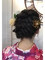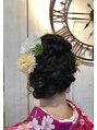 左サイドに流れるように編み込みとツイストをミックスしました。きっちりまとめすぎずルーズな感じにするのがポイント♪和装の花飾りでよりボリューム感と華やかさが出ます。
