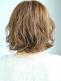 アゴラインのウェーブのボブスタイルです。パーマで動きをつくったのでラフで無造作な動きが楽しめます。中間巻きでフォワードリバース交互に巻いてかけ、トップは根元がおきるようにかけています。