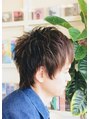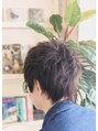 硬くて広がりやすい髪質ですが耳周りは中にレイヤーを入れてやわらかくくせ毛の様なラインになっています。フロント、トップには大きめのロットでボディパーマをかけ、ストロークカットを入れて更にやわらかなふんわり感が出る様になっています。
