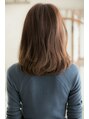 切りっぱなしのワンレングス。顔周りにしっかりレイヤーを入れたスタイルで揺れる毛束に。眉ギリギリの前髪で重×軽を。カラーは優しいピンクブラウン。