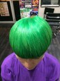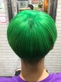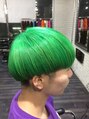 刈り上げマッシュヘアスタイル、ヘアカラーはダブルカラーでグリーン。