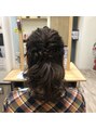 結婚式のパーティーセットです。あんまり気合い入れた感を出したくない人は、ハーフアップでナチュラルにドレスアップを楽しんでいただきたいです。顔まわりに編み込みを入れるとキュートなイメージになります。毛先はふわっと大きめカールでしあげてます。