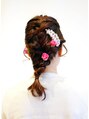 編み込みを中心としたダウンスタイルです。そこへピンクのミニバラを髪飾りにして可愛さが増々です。これ生花なんで綺麗し香りもいいですよ。オススメです。結婚式や二次会にもピッタリです。