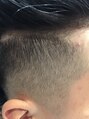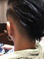 カット前のロングな髪をいかしてのツーブロック、ラインでワンポイントアクセント