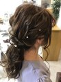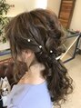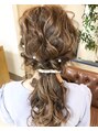 ポニーテールアレンジです。波巻きやコテで巻いた後にアレンジしています。結婚式や二次会などのアレンジの参考にしてください。