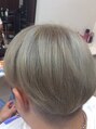 グラデーションカラーからのトーンダウンです。ブリーチ部分を活かしてサイドの毛先に濃いめのマットグリーンをいれています。落ち着いた中にもワンポイント違いをつくりました(^-^)