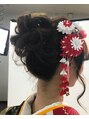 成人式パンフレット作成のスタイルです。首も長いモデルさんなので、スタイルはアップスタイルに身長はあまり高いモデルさんではないので着物の柄がきれいに見える様に着付けしてます。