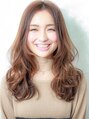前髪は作らずセンターパートのロングカールスタイル。レイヤーは入れず、シルエットをAラインでカット。中間から毛先にゆるくパーマをかけて重たく見えがちのAラインスタイルもふわふわ軽い印象に。カラーを明るめのベージュ系で柔らかく可愛い感じがGOOD♪