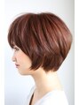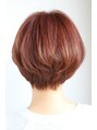 赤系のツヤが綺麗なショートボブスタイルです。リップラインの長さでトップに段を入れ、毛先を内に入るように切っているので誰でも簡単に乾かせてまとまりやすいスタイルとなっています。8トーンのピンクブラウンで赤みを極力強調したカラーとなっています。