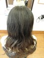 大きなウエーブ風の硬いクセ毛、毛先カラー毛が残っている。カラー毛はダメージ処理剤してから施術しました。♪