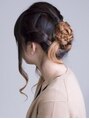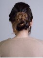 全体を緩めに巻き、オーバーサイドを分けます。トップは、ひとつに結び「くるりんぱ」します。両サイドは表編み込みをして、毛先は三つ編みをし、ラフに緩ませて毛先を留めます。下の位置で留めるとシニオン風になりますよ!