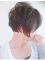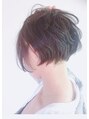前下がりスッキリショート。襟足は短めでスッキリ。顔まわりを長めに残すことで女性らしさを。カラーはブルーブラックで透け感を。