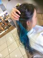 ブリーチが過去に2回やっているため、今回はブリーチなしでカラーしました。光にあたるとずプラチナグレーに見えるようにカラーしました!ポイントカラーで、ターコイズオーシャンカラーも入れて耳にかけたりすると、わかるようにカラーしました。