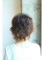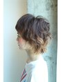 顔まわりを丸くマッシュに切り、えりあしを長めに残したミディアムショートスタイルです。強めにかけたコールドウェーブと長めに残したえりあしがエッジのきいたアクセントをもたらすスタイルです。
