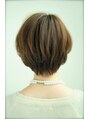 シンプルな中にも小技が光る上級者ショートヘア。ボーイッシュになりがちなショートも、 丸みのあるシルエットにし、柔らかな質感にすることで女性らしい表情に。 前髪は流しやすいように少し斜めにカット。