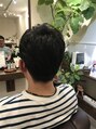 くせ毛で立ち上がりにくい髪を動きのある爽やかスタイルに普段眼鏡をかけるので もたつきがちなもみ上げをスッキリ。もみ上げツーブロック。