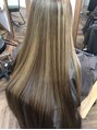人気の外国人風ハイライト。もう何度もハイライトをいれてるので、ベースはとても綺麗です。イルミナカラーとの発色も申し分なし。最高の透け感。ブリーチをなんども入れているのにこんなに長くてきれいなモデルさん。手入れをしっかりされている証拠ですね!
