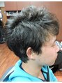 クセを活かしたパーマスタイル。ボリュームのでる耳周りの毛を短くしてサイドは収まりやすく、トップは暴れすぎないが適度に遊ばせる長さを残してメリハリを利かせた。整髪料も無造作につけることでクセが活かされるので普段のスタイリングも楽に。