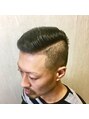 サイドは左右非対称のグラデーション刈り上げのバーバースタイル。ウェット仕上げで。