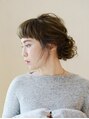 ハチ下耳前の髪だけ少し残し、低めのポニーテール。バランスよく全体に束感を引き出してから、結んだ毛先を三つ編みにして、ぐるっとまとめておだんごに♪サイドの髪の毛を、ねじって巻き付け、表面の束を引き出して完成です♪
