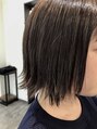 カットは肩上のショートボブ。低めの段と顔まわりに少しレイヤーを入れて、何もしない自然な時には内側に入りやすく可愛らしい印象になります。カラーはフォギーアッシュとモノトーンを混ぜた、くすんだカラーです。