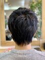 前髪を目のギリギリにしてマッシュ感を出し、トップは軽くする事で束感と、男性らしい動きと流れを。耳周りと襟足を少し残してナチュラルな雰囲気のある男性らしいショートヘア。世代を問わない定番の人気スタイル。