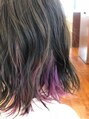 サイド、襟足部分にブリーチでトーンアップ後、色を調節したパープルを大胆に入れて、アクセントをプラス。