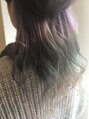 毛先はパープルからスモーク、オフホワイトのグラデーションカラー。トリートメントカラーで発色しています。