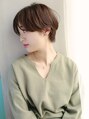 マッシュカールスタイル。ノットヘアで軽さを出したフェザーショートです☆ 大人かわいいショートスタイルは、センターパートも良し○マッシュベースに厚めバングでモードさ、ルーズさを♪ベージュ系カラーのマーメイドアッシュで柔らかさを♪