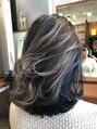 ケアブリーチでダメージを抑えブリーチした後、ダークネイビーと淡いグレージュカラーをオン。