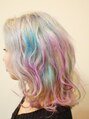 ハイトーン系ヘアカラーで人気のユニコーンカラー。ペールカラーのベースに、カラフルな配色。黒染め履歴、縮毛矯正でのハイダメージの方はお断りする場合がございます。ご了承ください。